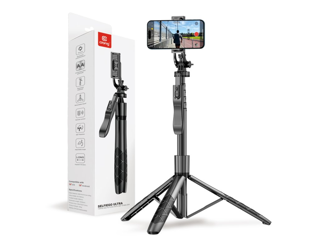 Crong SelfieGo Ultra – hliníkový stativ s Bluetooth selfie tyčí (černý)