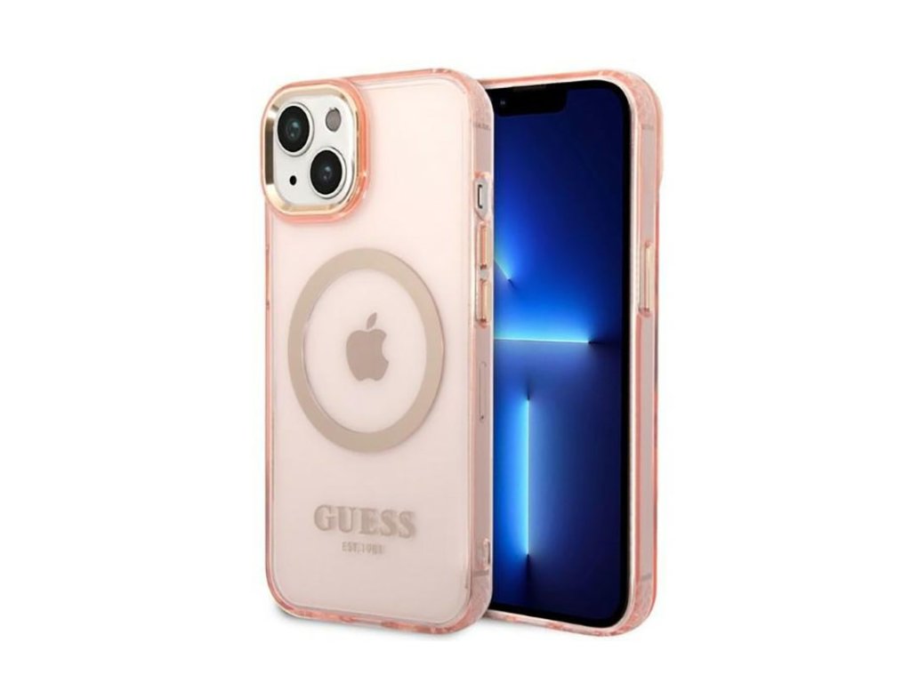 Guess Gold Outline Translucent MagSafe - pouzdro pro iPhone 14 Plus (růžové)