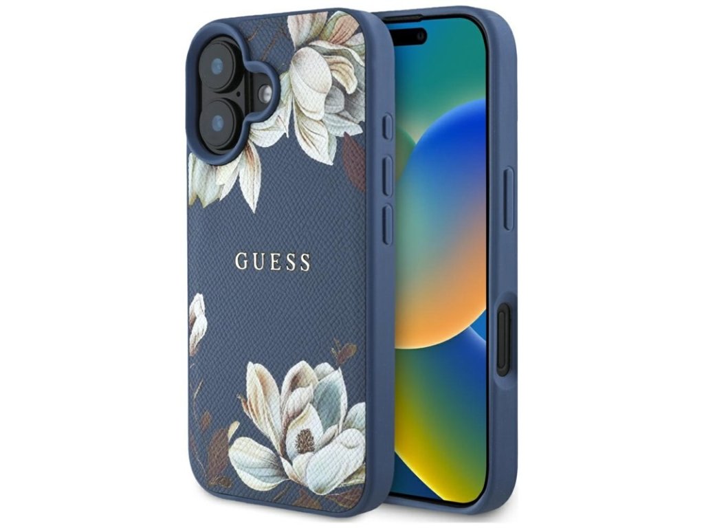Guess Grained Printed Flower Pattern MagSafe - Pouzdro pro iPhone 16 (modrý)