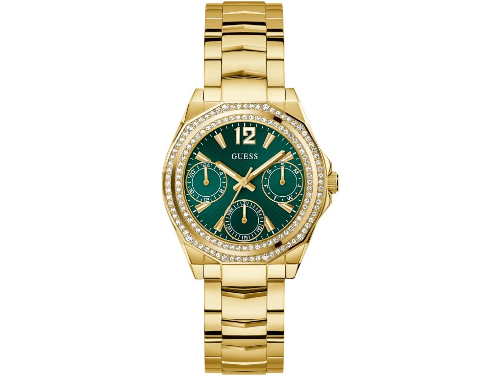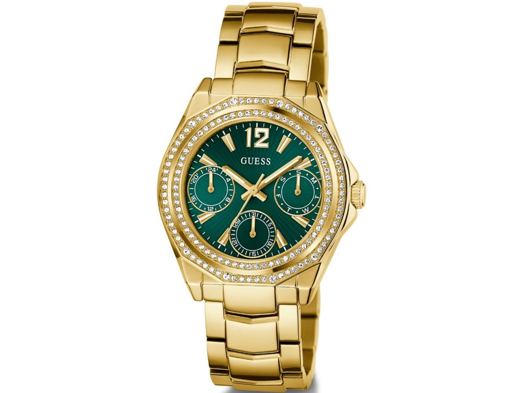 • Manufacturer no.: GW0685L5 • Manufacturer series: Ritzy 36mm 5ATM • Functions: 24-hours, Date, Minute, Second, Hour, Day • Movement: Battery (quartz) • Dial color: Green • Display: Analog • Water resistant: 5 • Bezel: Fixed • Surface finish: Polished • Case color: Gold • Case material: Stainless steel • Case thickness: 10 • Case shape: Round • Case trimming: Zirconia • Case width: 36 • Caseback: Stainless steel bottom, pressed • Gender: Ladies • Glas: hardened, Mineral glass • Style: Modern • Strap material: Stainless steel • Strap color: Gold • Lug width: 18 • Clasp: Folding clasp • Max wrist circumferences: 180 • Item weight: 0.11 • Scope of delivery: Instruction, Box, Warranty doc., Packaging