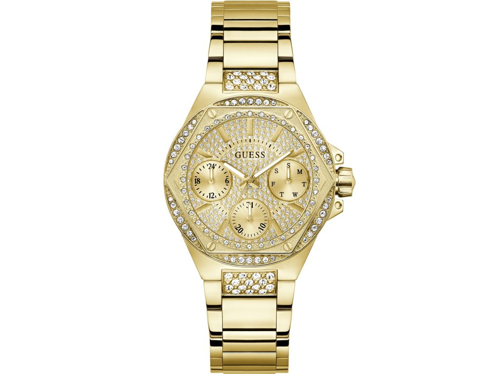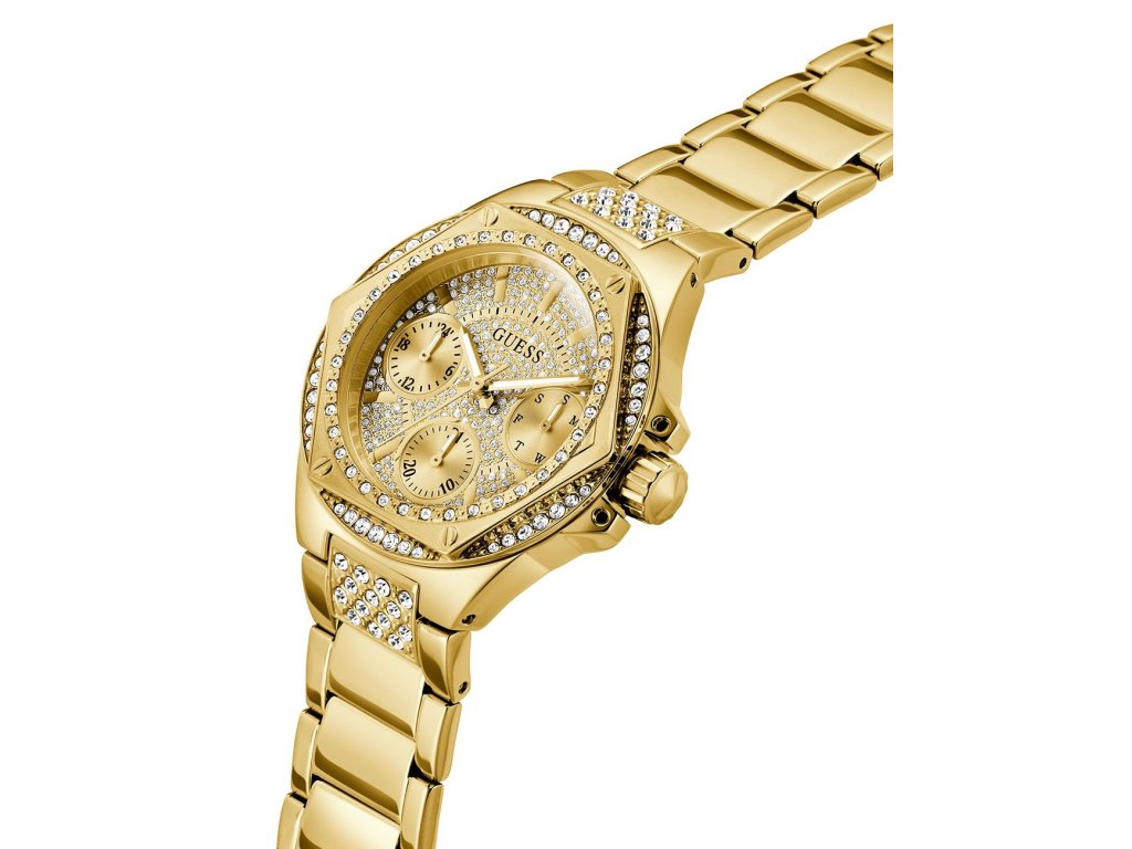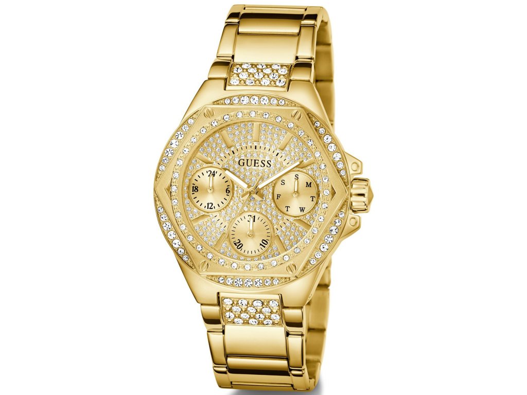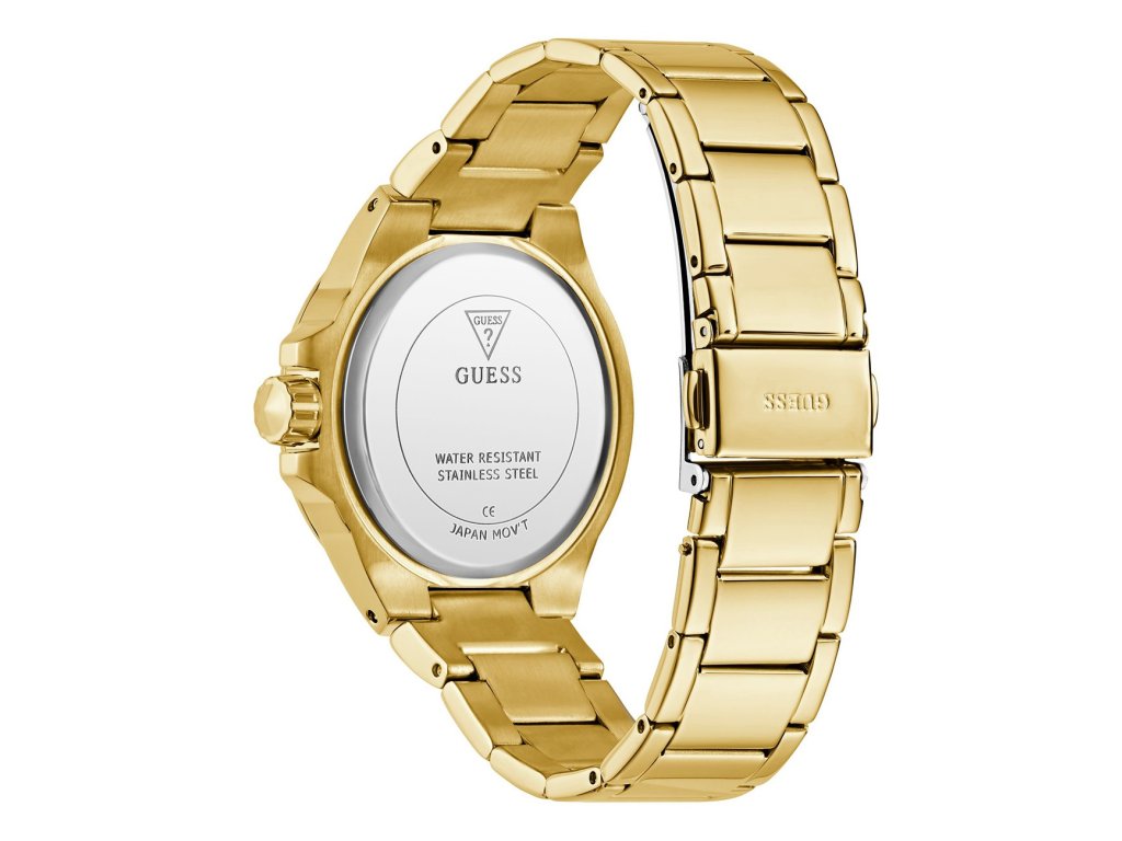 • Manufacturer no.: GW0878L2 • Manufacturer series: Envy 40mm 1ATM • Functions: 24-hours, Date, Minute, Second, Hour, Day • Movement: Battery (quartz) • Movement label: Japan • Dial color: Golden • Display: Analog • Water resistant: 1 • Bezel: Fixed • Surface finish: Polished • Case color: Gold • Case material: Stainless steel • Case thickness: 11 • Case shape: Square • Case trimming: Zirconia • Case width: 40 • Caseback: Stainless steel bottom, pressed • Gender: Ladies • Glas: hardened, Mineral glass • Lighting: Illum. hands • Style: Modern • Strap material: Stainless steel • Strap color: Gold • Lug width: 12 • Clasp: Folding clasp • Max wrist circumferences: 190 • Item weight: 0.11 • Scope of delivery: Instruction, Box, Warranty doc., Packaging