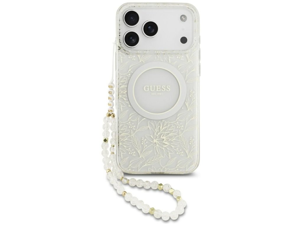 Guess IML Flowers Electro Pearl Strap MagSafe - Pouzdro iPhone 17 Pro Max (bílý)