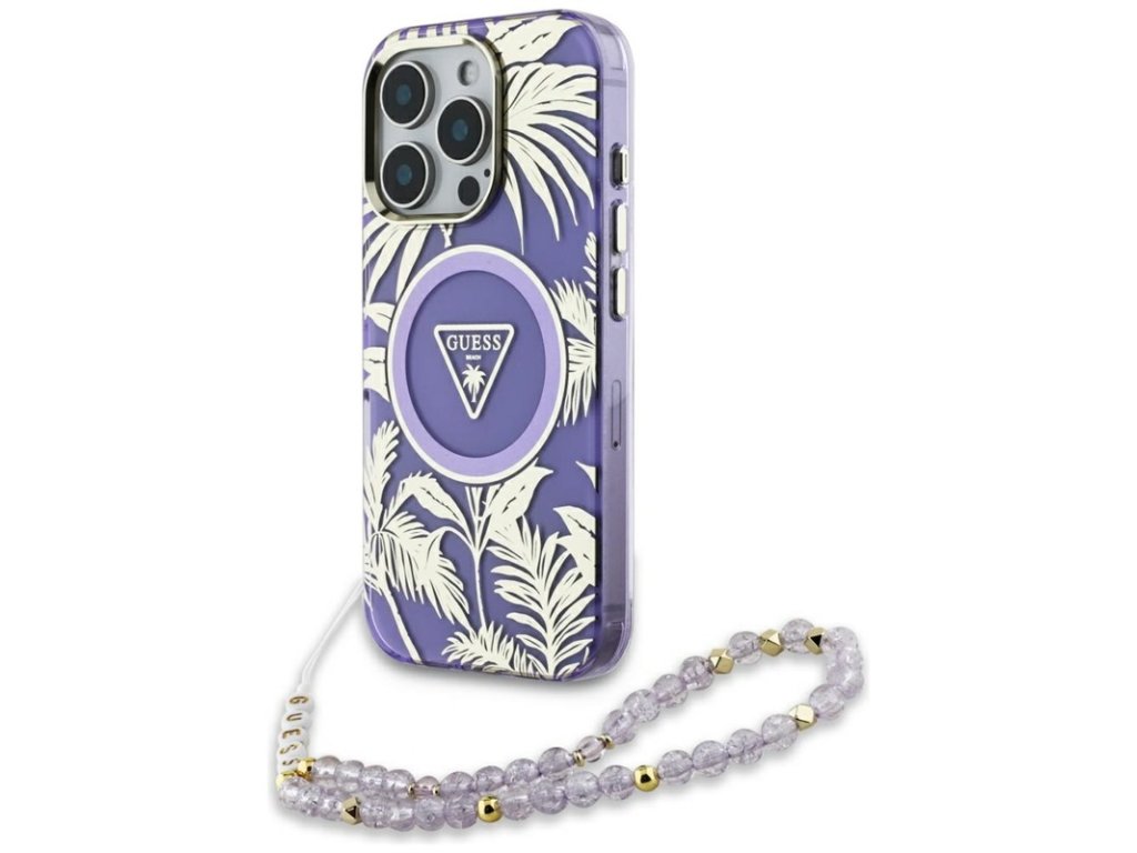 Guess Palm Trees Triangle Pearl Strap MagSafe - Pouzdro pro iPhone 16 Pro Max (fialový)