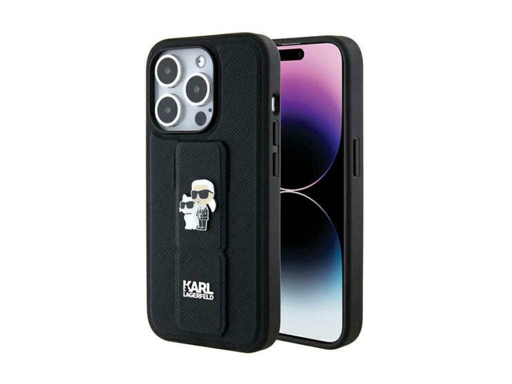Karl Lagerfeld Gripstand Saffiano Karl & Choupette Pins - pouzdro pro iPhone 14 Pro (černé)