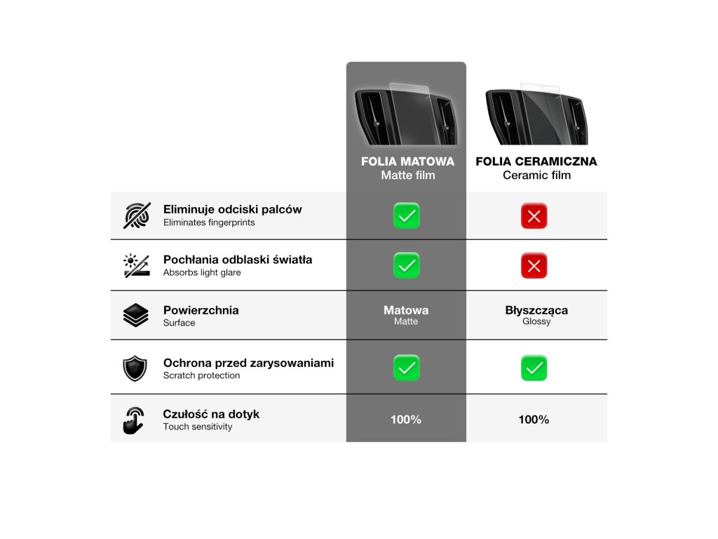 Keramická fólie neabsorbuje otisky prstů. Je vyrobena z materiálu s vysokou tvrdostí, který poskytuje účinnou ochranu proti poškrábání. Displej vašeho vozu bude chráněn před poškozením způsobeným klíči, mincemi nebo jinými ostrými předměty.