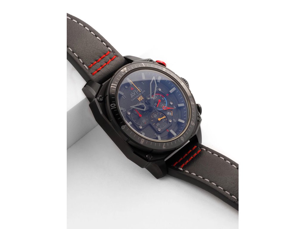 • Manufacturer no.: AV-4100-04 • Manufacturer series: Hawker Hunter Dual Time Chronograph 43mm 5ATM • Functions: 24-hours, 2 timezones, Chronograph, Date, Minute, Second, Hour • Movement: Battery (quartz) • Movement label: Japan • Dial color: Black • Display: Analog • Water resistant: 5 • Bezel: Fixed • Surface finish: Matted, Polished • Case color: Black • Case material: Stainless steel • Case thickness: 14 • Case shape: Round • Case width: 43 • Caseback: Stainless steel bottom, screwed • Gender: Mens • Glas: anti-reflecting, hardened, Mineral glass • Lighting: Illum. indexes, Illum. hands • Style: Sporty • Strap material: Calf leather • Strap color: Black • Lug width: 22 • Clasp: Buckle clasp • Max wrist circumferences: 215 • Item weight: 0.11 • Scope of delivery: Instruction, Box, Warranty doc., Packaging
