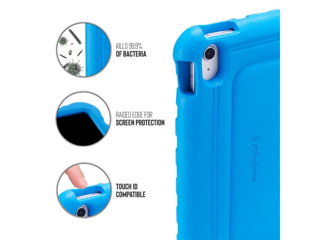 - Je certifikován tak, že eliminuje 99,9 % bakterií, se kterými se obal dostane do kontaktu, aby vaše dítě zůstalo v bezpečí. Navíc je testován na pády a poskytuje kompletní ochranu při pádu až do výšky 1,2 m/4 ft, aby byl váš iPad také v bezpečí.