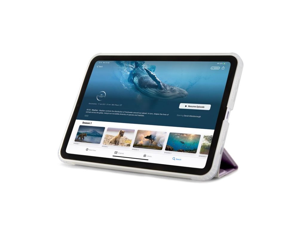 - Diskrétní drážka pro Apple Pencil na boku, která umožňuje synchronizaci a nabíjení Apple Pencil přes pouzdro, a funkci automatického uspání a probuzení, která prodlužuje výdrž baterie a umožňuje až o 20 % delší používání mezi jednotlivými nabitími.