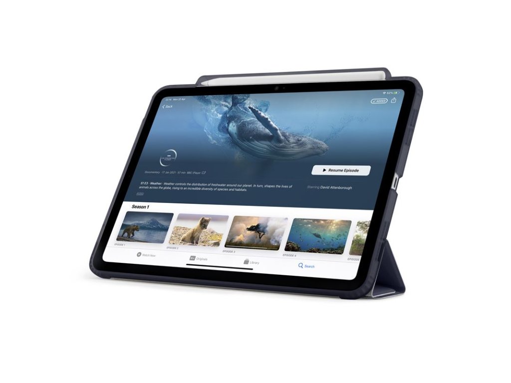 - Diskrétní drážka pro Apple Pencil na boku, která umožňuje synchronizaci a nabíjení Apple Pencil přes pouzdro, a funkci automatického uspání a probuzení, která prodlužuje výdrž baterie a umožňuje až o 20 % delší používání mezi jednotlivými nabitími.