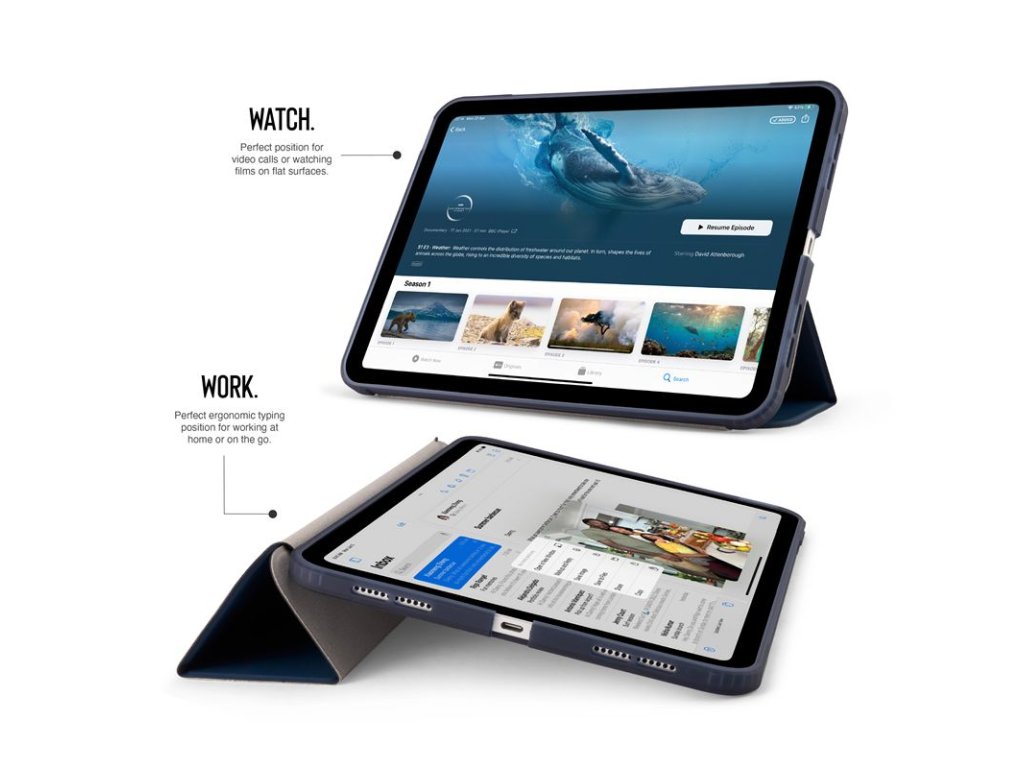 Trojitý chytrý kryt nabízí polohy stojánku 2 v 1: vzpřímený úhel pro sledování filmů bez použití rukou a nižší ergonomický úhel pro psaní, skicování, hraní her nebo produktivní práci s Apple Pencil.