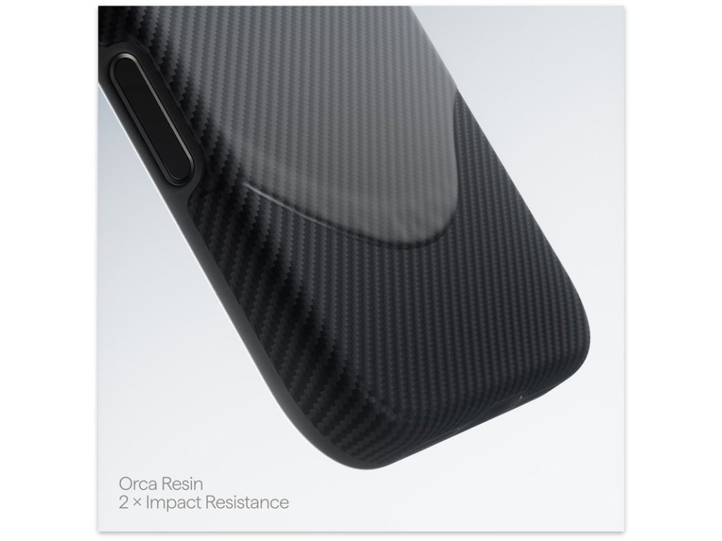 - Orca Resin: PITAKA Orca resin, spojený s aramidovým vláknem, zvyšuje pevnost o 200 % a zdvojnásobuje odolnost proti nárazům. V kombinaci s elasticitou TPU poskytuje dvojitou ochranu – tvrdou ochranu a měkké tlumení – a překonává tak tradiční termosetové pryskyřice.