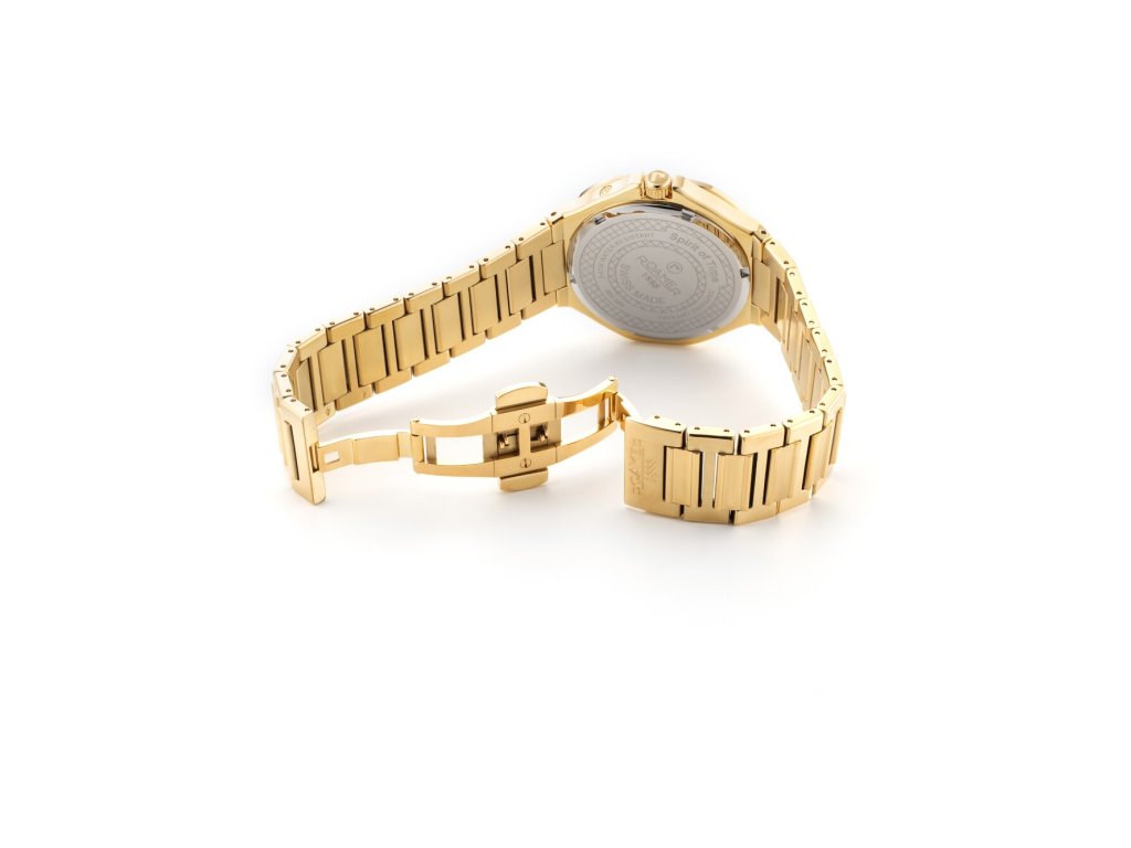 • Manufacturer no.: 995989 48 85 20 • Manufacturer series: Spirit of Time full calendar 42mm 3ATM • Functions: Date, Minute, Month, Second, Hour, Day • Movement: Battery (quartz) • Movement label: Ronda, Swiss Made, 706.3 • Dial color: Black • Display: Analog • Water resistant: 3 • Bezel: Fixed • Surface finish: Polished • Case color: Gold • Case material: Stainless steel • Case thickness: 10 • Case shape: Square • Case width: 42 • Caseback: Stainless steel bottom, screwed • Gender: Mens • Glas: anti-reflecting, Saphire glass • Lighting: Illum. indexes, Illum. hands • Style: Modern • Strap material: Stainless steel • Strap color: Gold • Lug width: 22 • Clasp: Butterfly clasp • Max wrist circumferences: 170 • Item weight: 0.16 • Scope of delivery: Instruction, Box, Warranty doc., Packaging