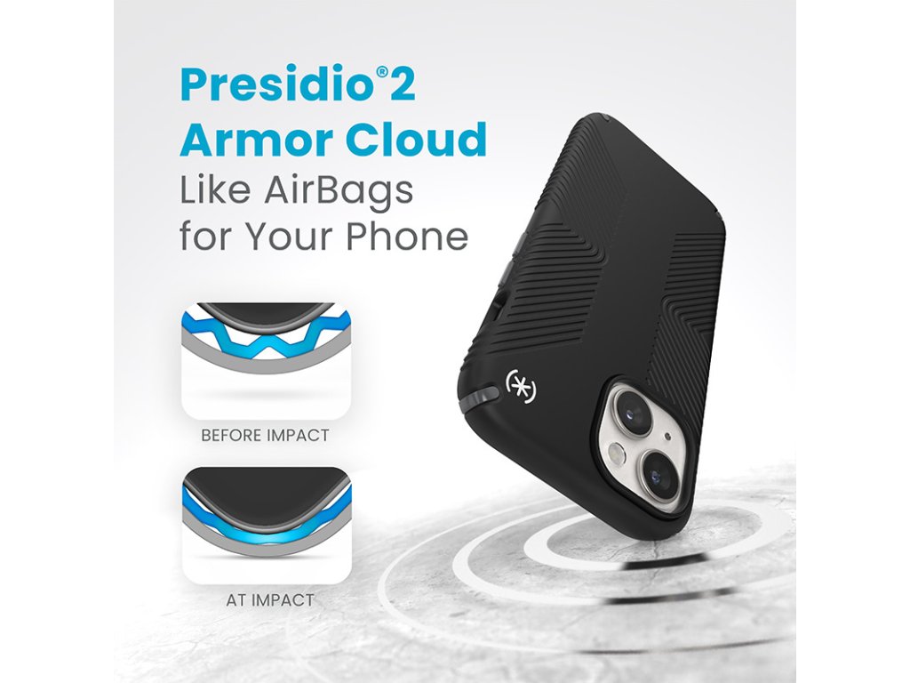 Pouzdro Presidio2 Grip MagSafe je také vyrobeno technologií Armor Cloud™, díky které je pouzdro Speck odolné vůči pádům z výšky až 4 metrů. Systém mikrokapslí uvnitř stěn pouzdra funguje na podobném principu jako airbagy používané v automobilech. Při pádu na tvrdý povrch kapsle absorbují sílu nárazu pomocí vzduchu v nich stlačeného.