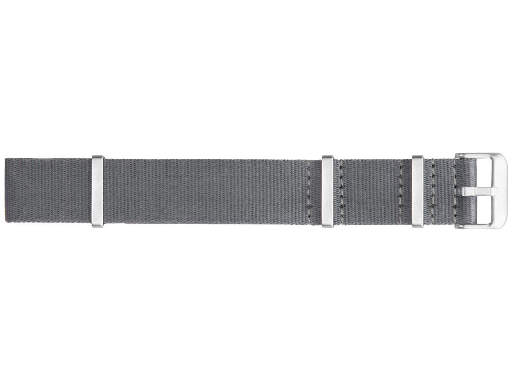 Řemínek na hodinky od firmy A-nis, modelové označení ANN001.43. Materiál řemínku je textil. Dostupný je v šířce 20 až 22 mm. Řemínek dodáváme včetně 2 ks stěžejek. Šedo-černý Nato Seatbelt řemínek s matnou ocelovou sponou.